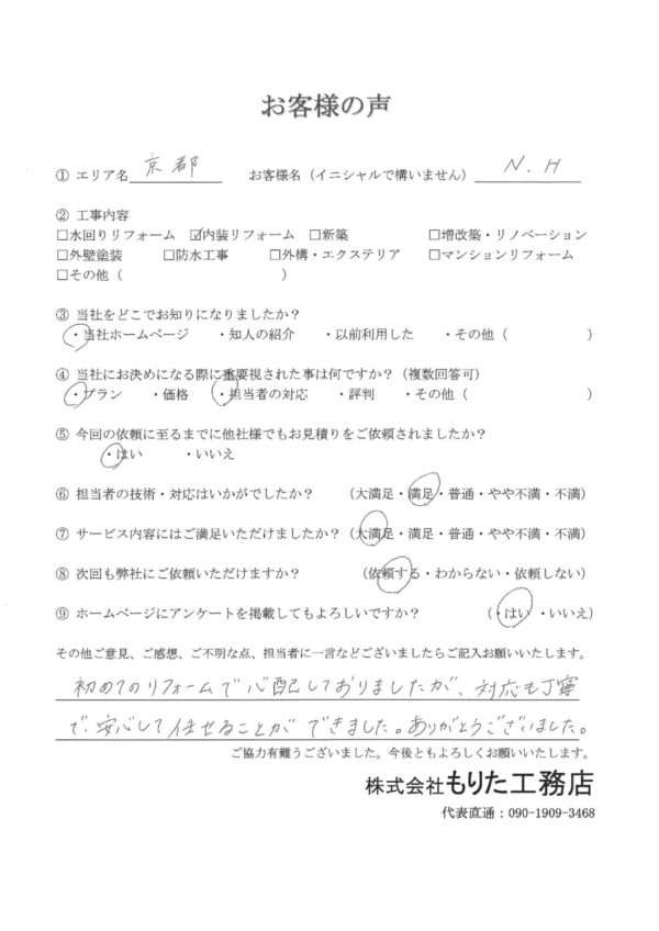 初めてのリフォームで心配しておりましたが、対応も丁寧で安心して任せることができました。ありがとうございました。